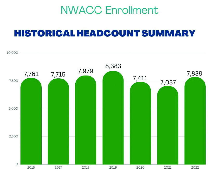 NorthWest Arkansas Community College’s unofficial fall enrollment jumped more than 10%. The college announced an unofficial fall 2022 credit enrollment of 7,839, according to a news release from Liz Kapsner, associate director of communications at NWACC. That figure was up 10.7% from the fall 2021 number of 7,037. The news release also incorporated figures from enrollment in industry and workforce classes and the adult education program. Those additions brought the total number enrolled to 9,475 students.