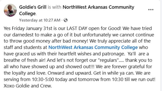 The food shop in the Bentonville campus’s Student Center, Goldie’s Grill, hit the public this week with news of its closure. Today (Jan. 31) is the grill’s last day.
